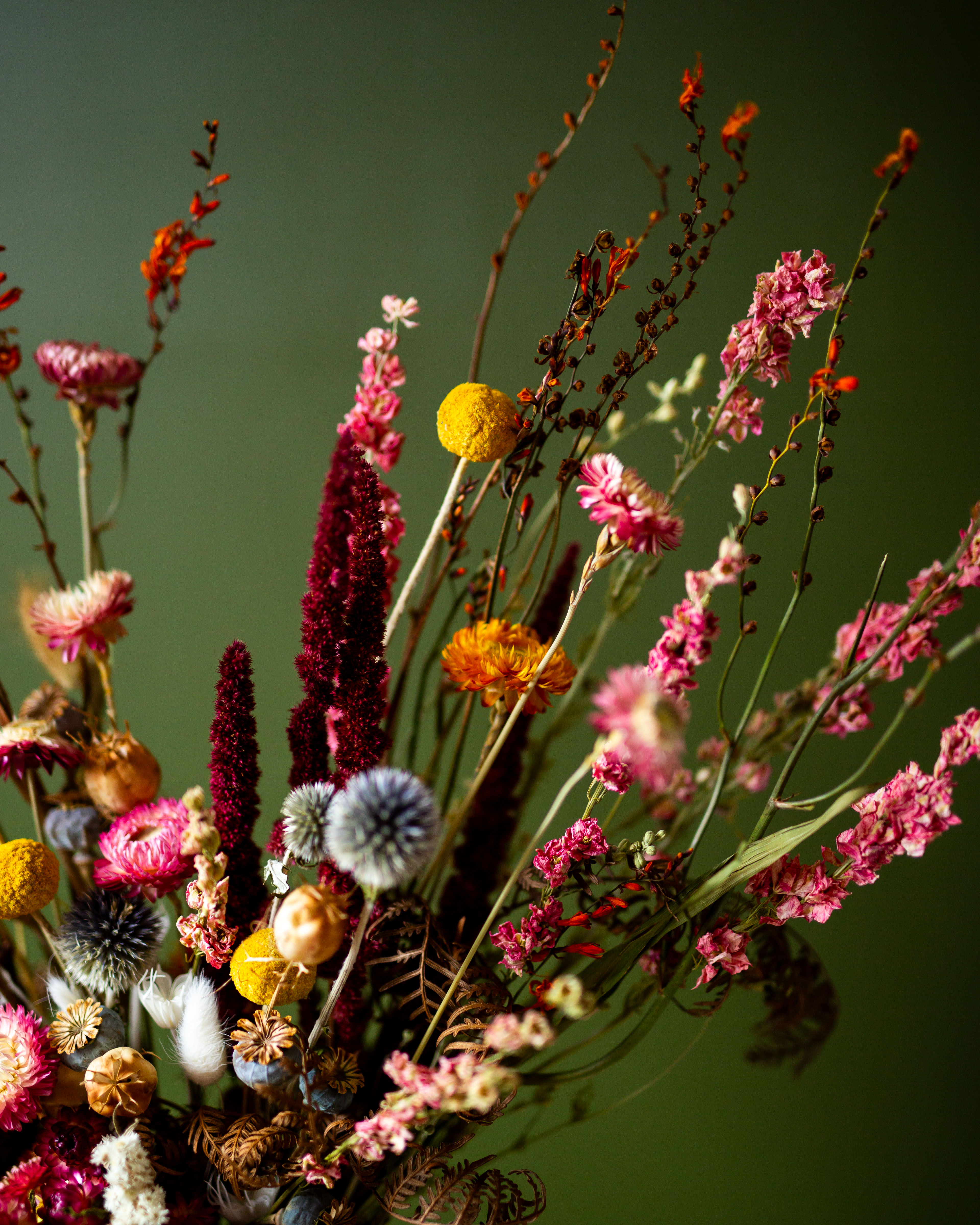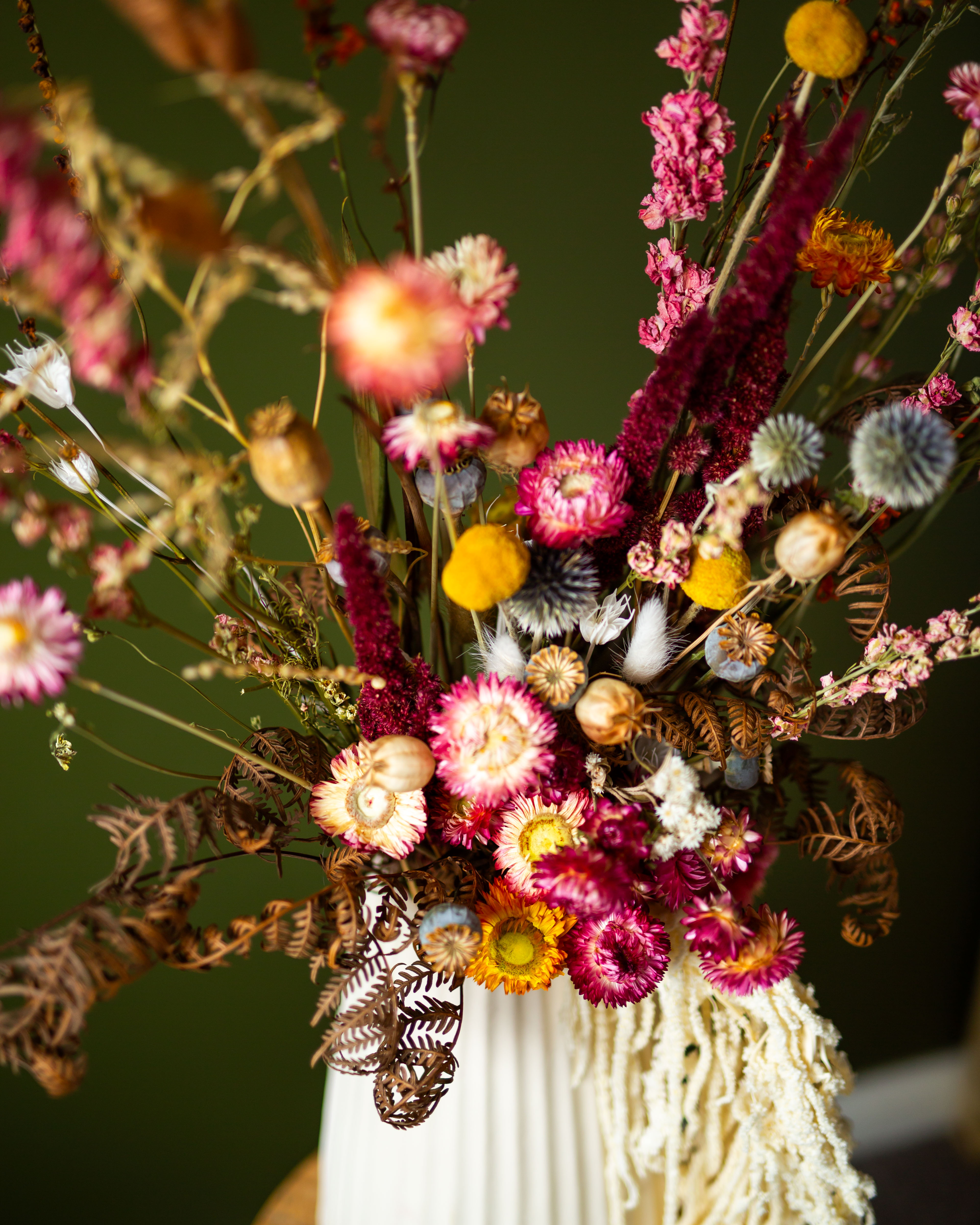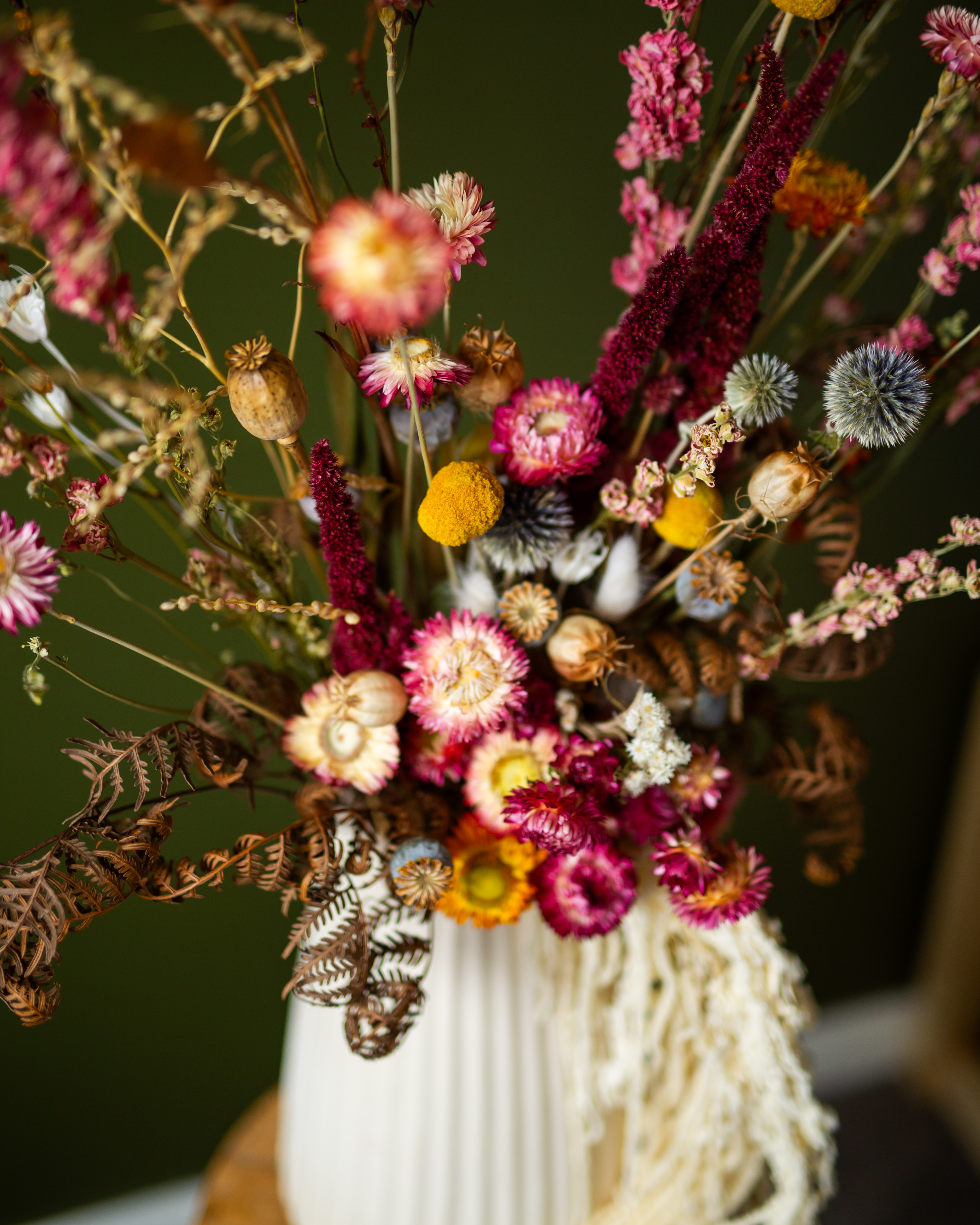 Our ready to go dried flower vessels are a beautiful statement piece. They have been arranged with time and care. Every flower added has been thoughtful and precise. Positioned in place with care and intention.